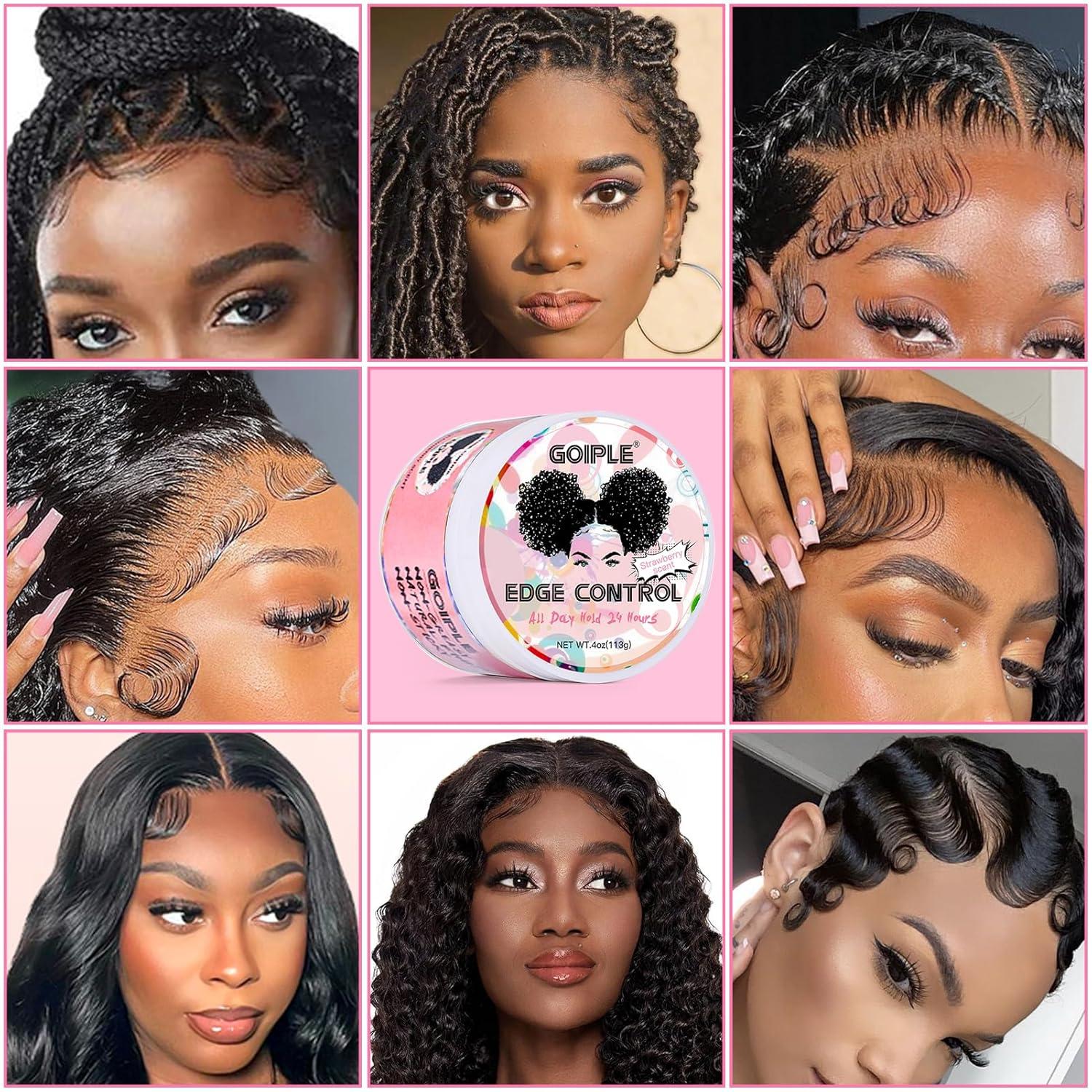 Goiple Edge Control Wax for Women Strong Hold Non-greasy Edge Smoother Strawberry Scent Edge Control Wax + Edge Scarf + Hair Bonnet, Pink(edge control & black castor oil-7pcs)