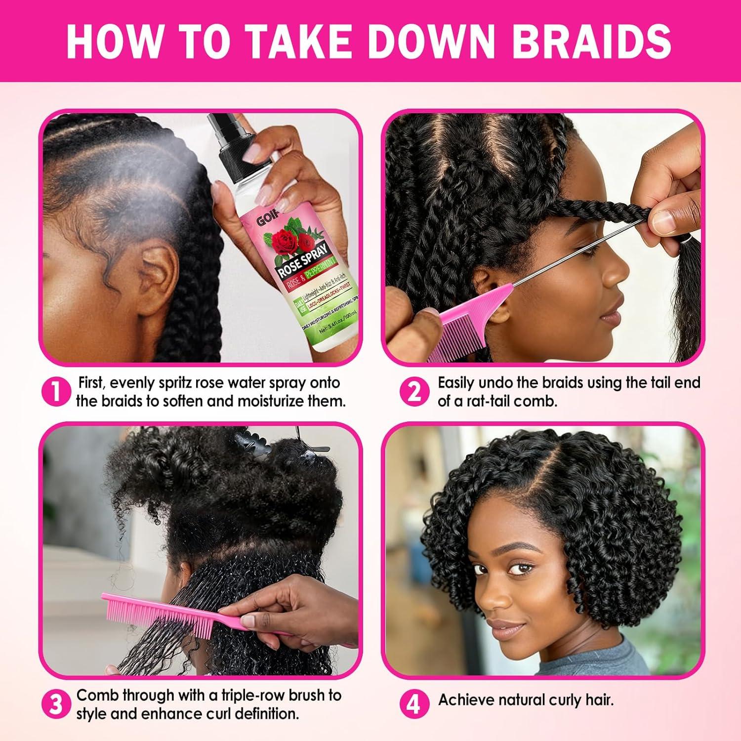Begin with our nutrient-rich Rose Water Spray to moisturize and soften braids, enhancing natural shine while preparing hair for stress-free detangling. Then, glide through braids with our precision 3 row comb and specialized rat tail combs for women, designed to smoothly separate and unravel even the tightest styles without tugging or discomfort.